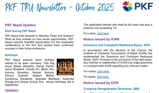 Our clients dont just work with us at PKF T. R. Upadhya and Co. They gain the advantage of a thriving global network that's creating powerful opportunities in Nepal and worldwide. The newly released PKF Global Annual Review 2024 showcases how this advantage translates into better service for businesses like yours. With over 23,000 leading experts based in PKF’s 214 member firms, we’re proud to connect you to the brightest minds in the business. We draw on the specialist knowledge of our colleagues around the world to provide you with innovative solutions. We can support your international expansion by collaborating seamlessly with fellow PKF members across the globe. We leverage our relationships within our global community to give you a coordinated approach, continuity and consistent best-in-class services, wherever your business takes you. We’re part of a network that constantly invests in technology, giving us access to the latest solutions and helping us ensure you stay ahead of the curve. The Annual Review shows how PKF has continued to grow despite economic headwinds – expanding to 214 member firms, with global revenues increasing to $2.1 billion. This growth means more resources, more capabilities and more opportunities for your business. Download [https://bit.ly/3E9uYTx] the PKF Global Annual Review 2024 and discover how our global strength can become your competitive advantage.